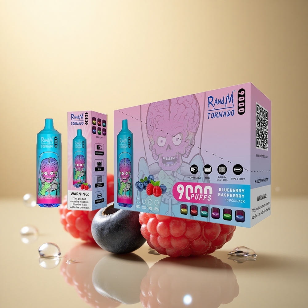 RandM Fumot Tornado 9000 Puffs אוכמניות פטל עם סוללה 850 mAh וסליל מש