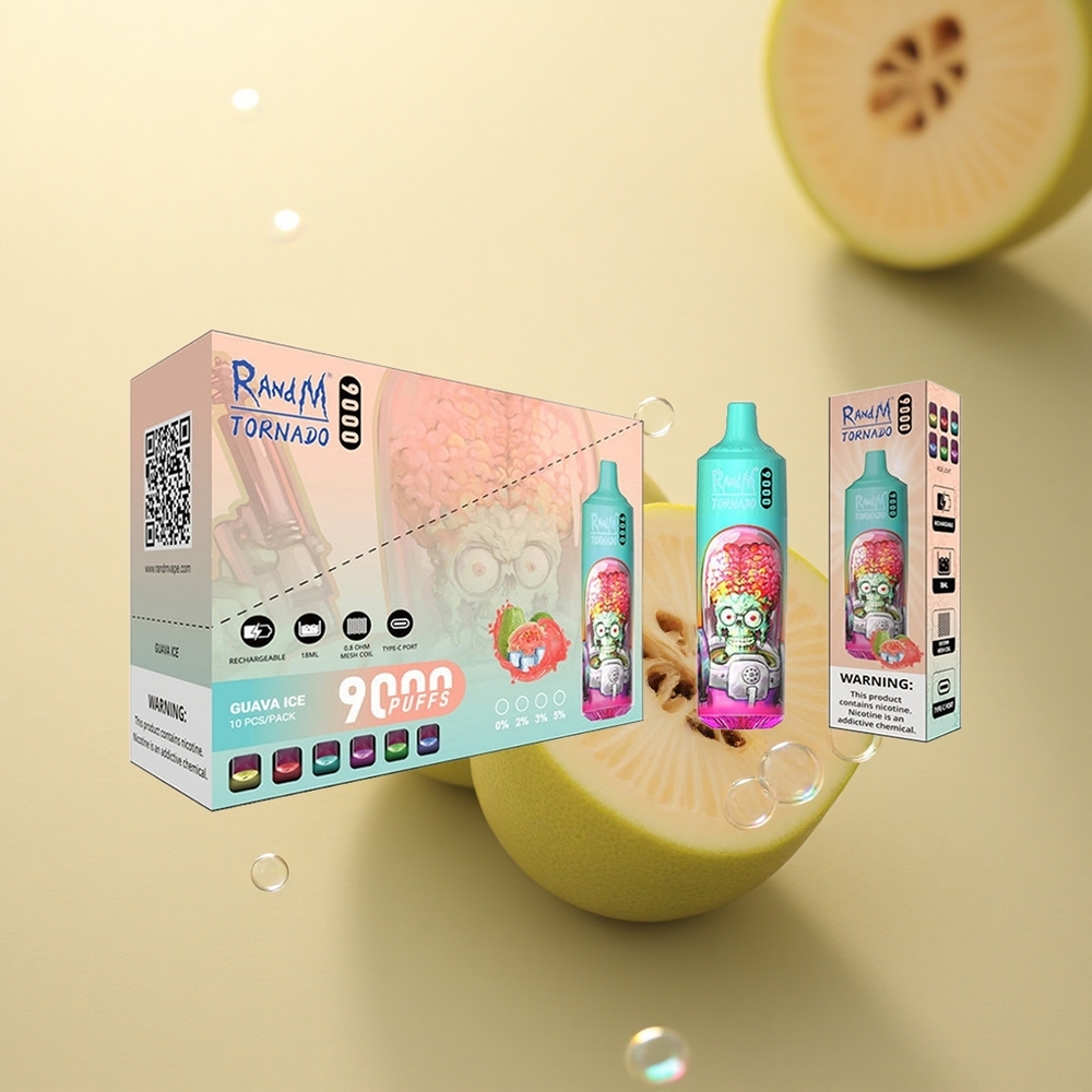RandM Fumot Tornado 9000 Puffs גויאבה קרח עם סליל משי ו-18 מל נוזל ו-850 mAh